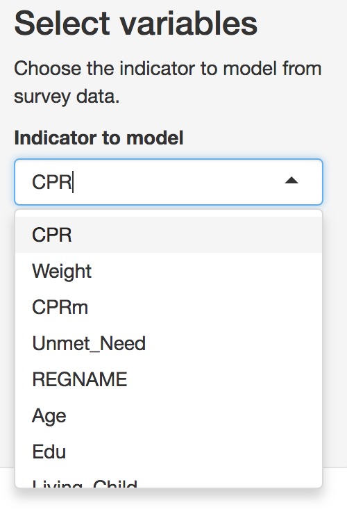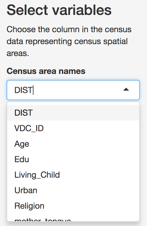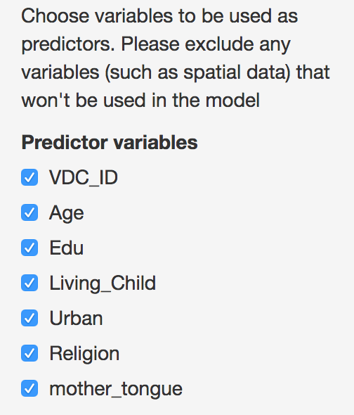 Users then can select the predictor variables that will be. Note that only predictors that appear in both survey and census data can be selected. To reduce confusion, it is best that the loaded data only include variables that will be relevant to the analysis. However, these variables can be removed later if they are not needed.