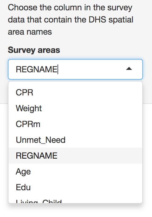 Note that only binary variables are currently supported. Variables should be formatted as ‘0’ or ‘1’ only. Users should then select which variable represents the region or strata names in the data, as these will be used both in mapping and in creation of fixed or random effects. These region names should also be present and identically named in the census data to ensure accurate matching between the datasets.