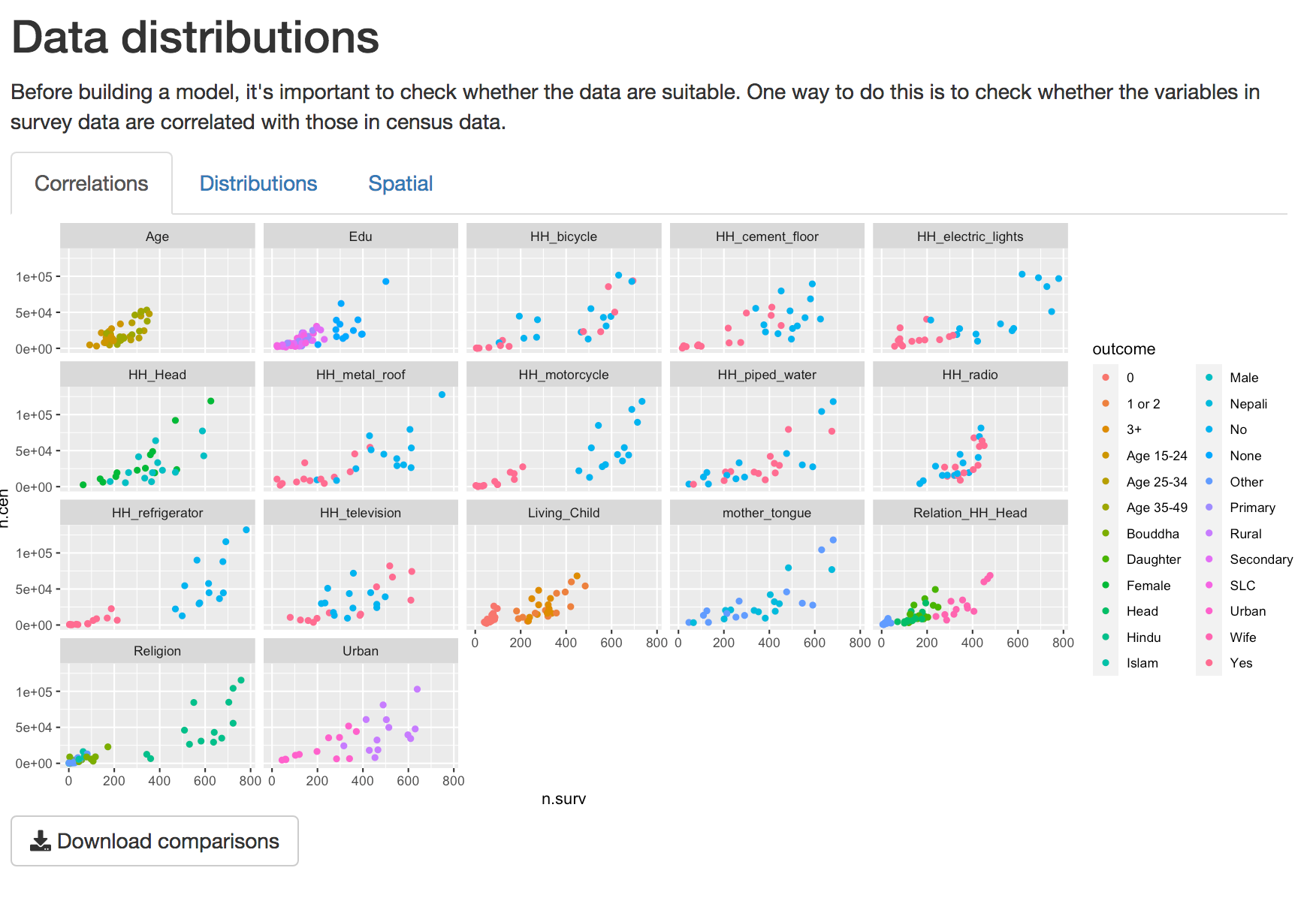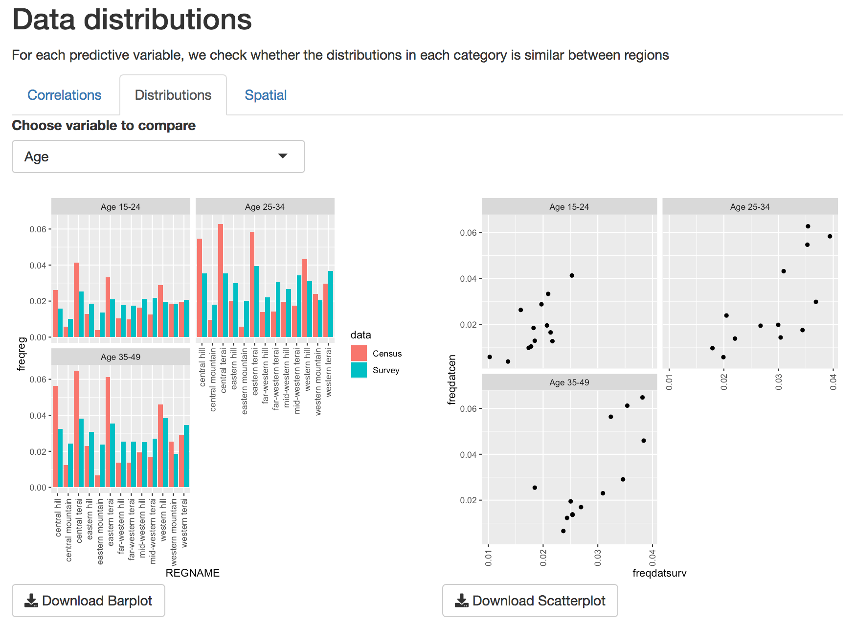 When opening the Compare data Tab, the first tab displays a scatterplot of the correlations between data variables. These plots are based on data aggregated at the survey region level. Variables that appear linearly correlated between survey and census shold be considered for inclusion in the model. Those that are not should be excluded, unless there is some reason to explicitly include them.