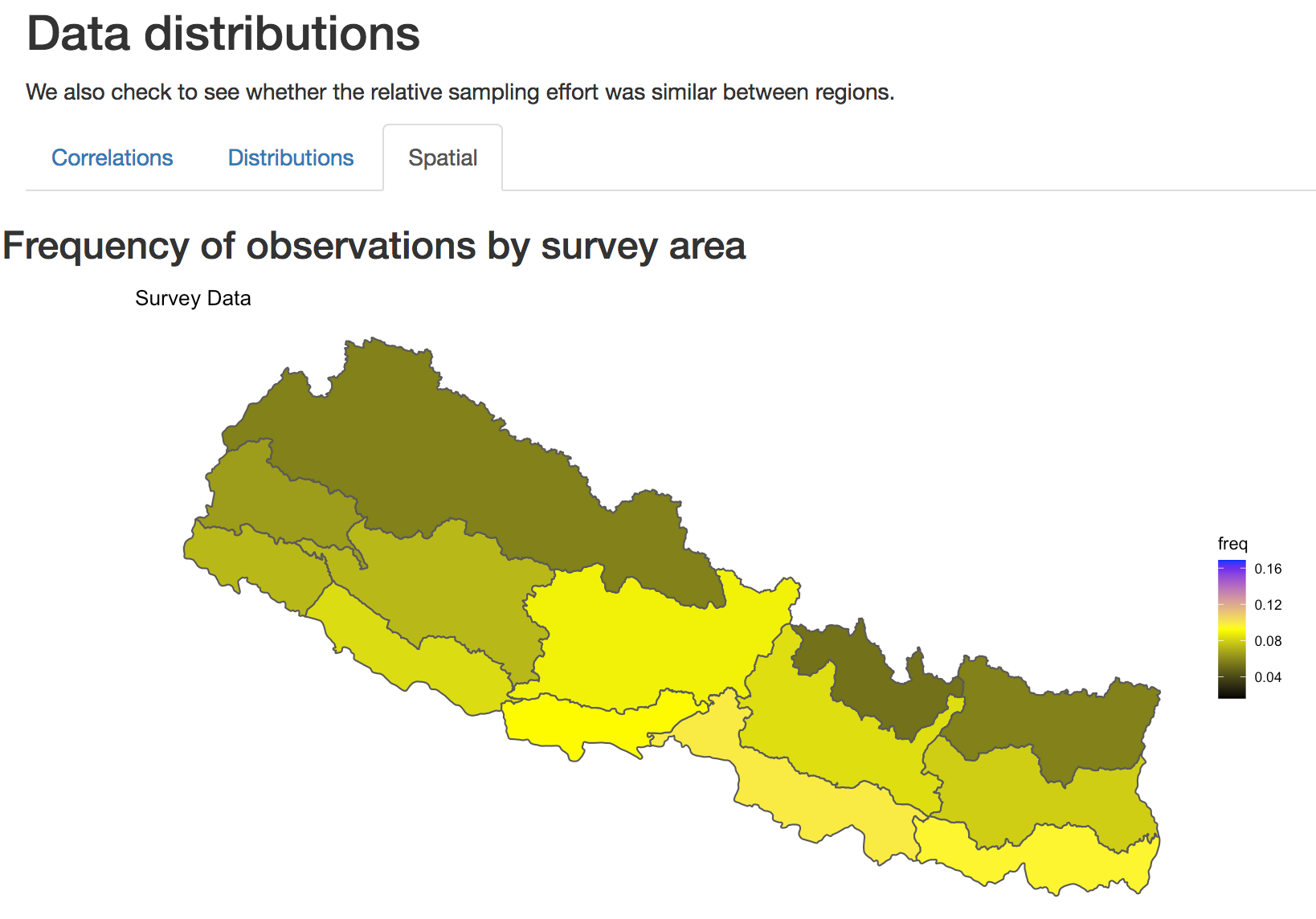 A simple way to check whether the two data types are related is to look at how closely they are correlated. This can be difficult to do with binary data, so we aggregate these data at the level of survey regions and visualize as a scatterplot. By default these correlations are only shown for variables checked in the ‘Data Selection’ tab.