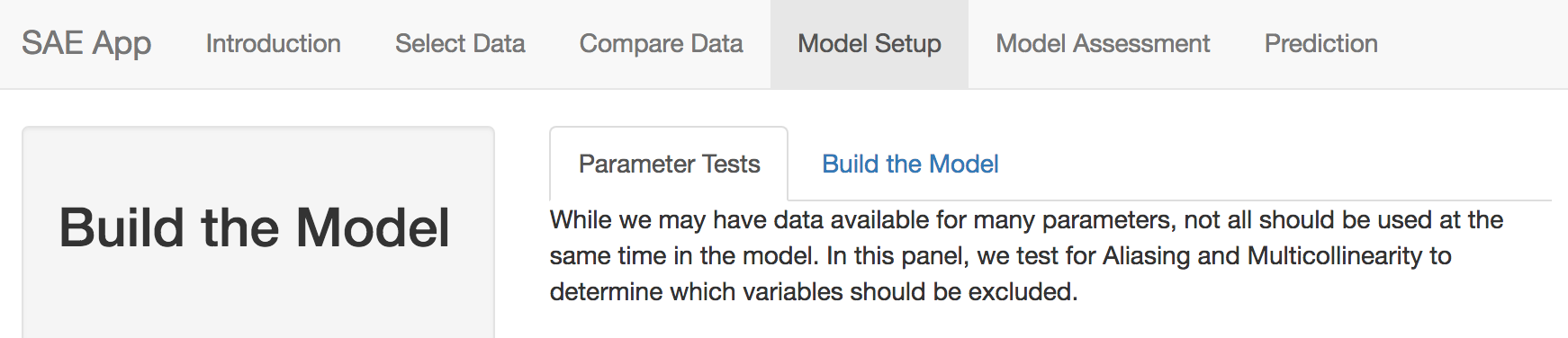 The application consists of different tabs for each stage of the analysis. These include selecting and comparing data, Setup of the models, model assessment and finally prediction. Under each tab, simple directions allow the user to control outputs and download results. Note that the contents of each tab depend on the previous tab results, so errors in data setup will propogate through the application and may result in error messages instead of expected results.