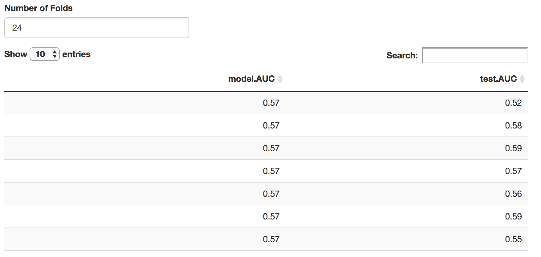 Results of the cross validation. Similar AUC scores in the training and test data indicate the model is relatively stable.