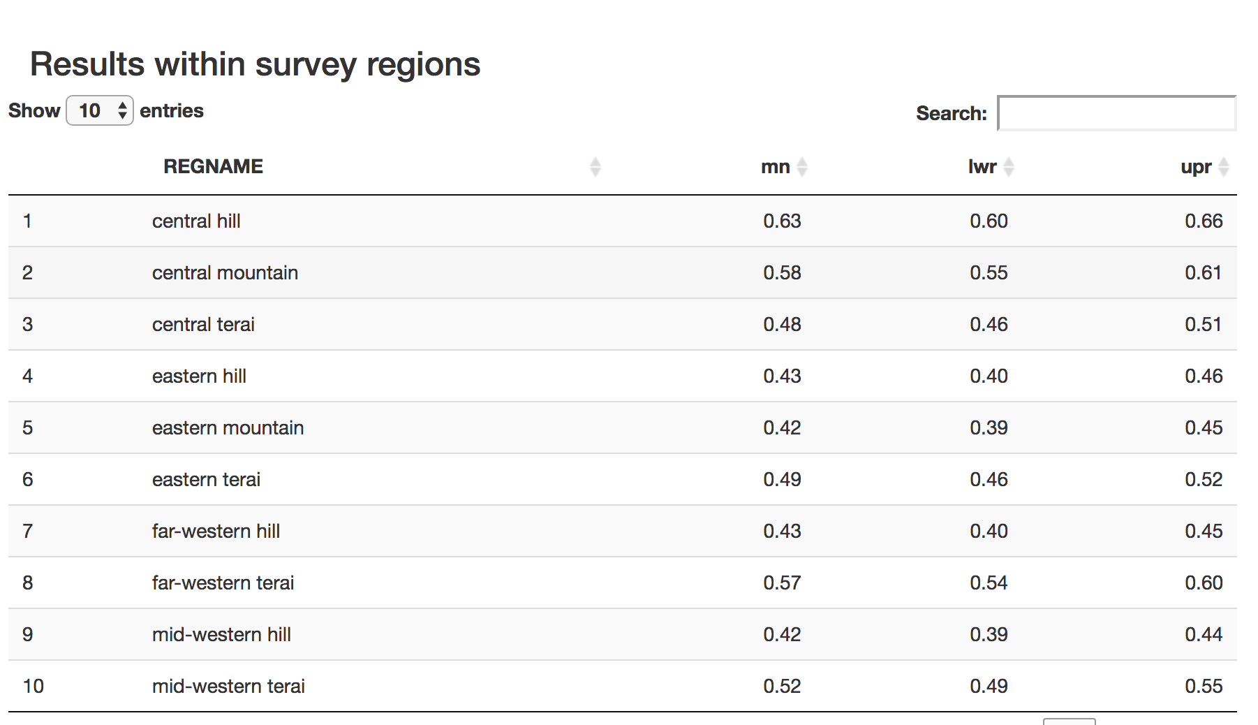 indicator of interest, a column for the names of the survey regions used