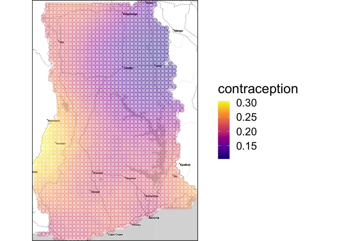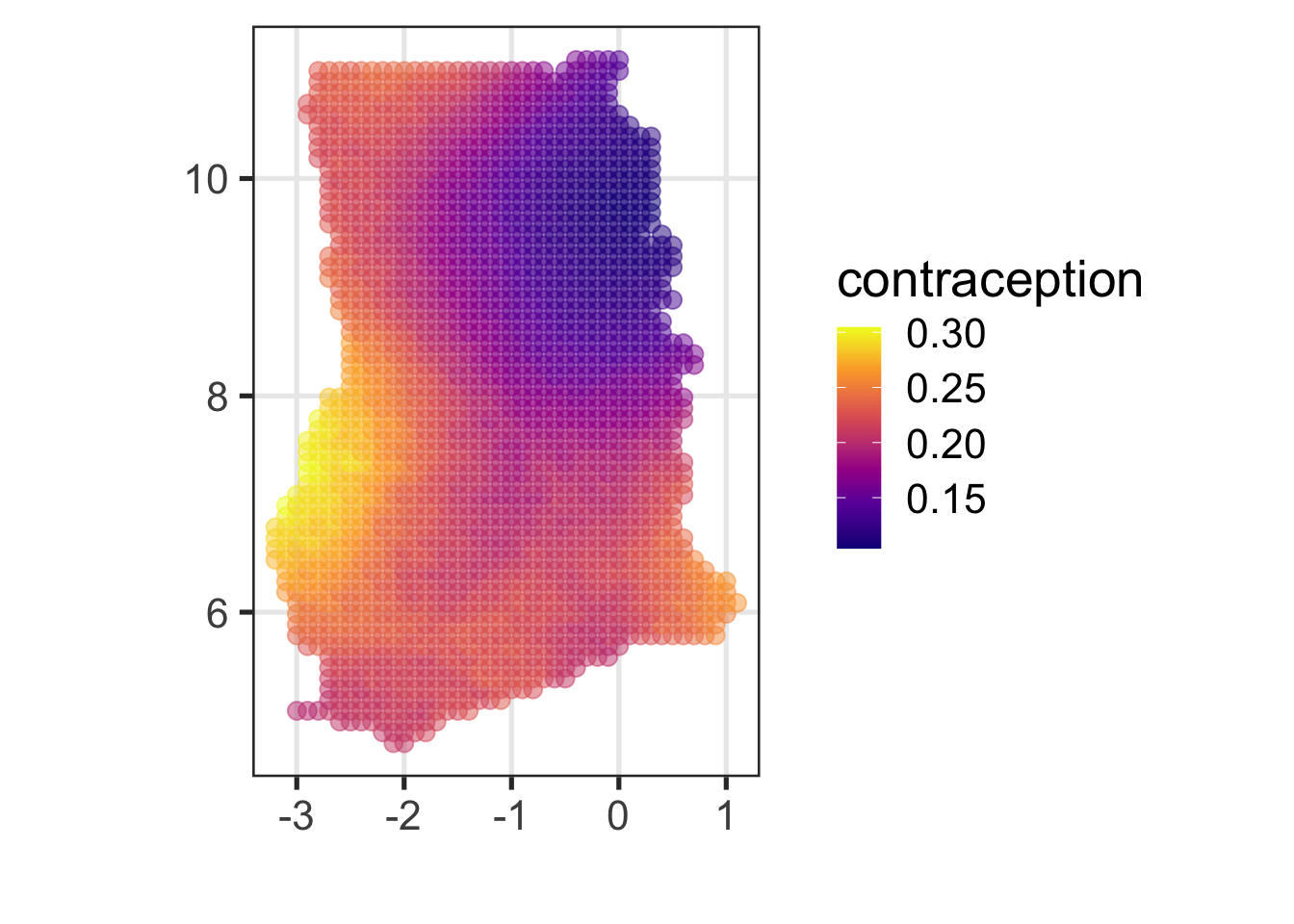 geom_point(data = raster_tbl, aes(y = lat, x = lon, colour = m_yhat), size = 3, alpha = 0.3) + scale_colour_viridis_c("contraception", option = "C"))